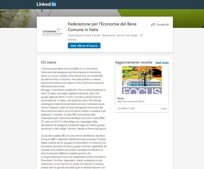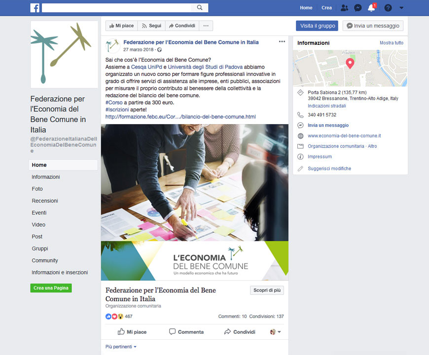 Creazione del flyer e della Landing Page per la promozione delle iscrizioni al Corso per Consulenti e Tecnici del Bilancio del Bene Comune. Attivazione campagna Facebook e Linkedin. Ideazione post per coinvolgere e fidelizzare i Fan della pagina.